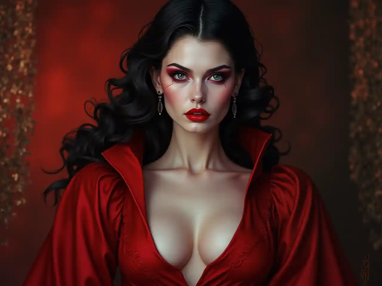 Vampira, séduction, femme fatale, vampire coloré, yeux maléfiques, regard hypnotique, jupe rouge, cuir de porcelaine