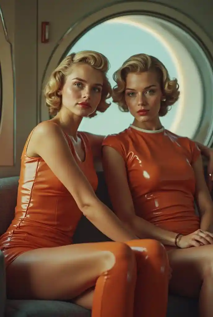 Assis sur le canapé, excentrique, deux belles filles mannequins de mode des années 50, bodywear spatial de pointe des années 50, intérieur d'un vaisseau spatial des années 50, Vénus voyage, film