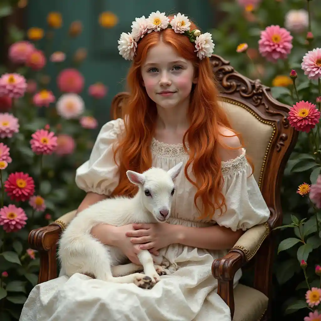 Portrait de style victorien La belle jeune fille aux cheveux roux ondulés, assise sur une somptueuse chaise, tenant une petite chèvre blanche, dans le jardin, des millions de fleurs colorées, des corolles de fleurs, dans le style de Kirsty Mitchell, 8k, photographie haute définition