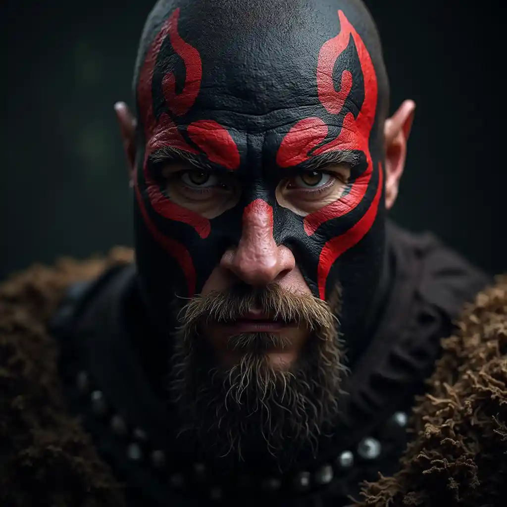 Portrait ultra-réaliste d'un chef guerrier viking, peint d'un maquillage de panthère noir tribal rouge vif sur une base noire profonde, capturant des détails complexes de texture de peau du contour frontal. Avec un regard sérieux, le guerrier regarde nerveusement devant lui, incarnant une présence majestueuse. Le portrait de 50 mm f2 capture l'apparence accrocheuse avec la caméra GFX100 et utilise un éclairage de bord vif pour souligner les caractéristiques sévères du sujet.