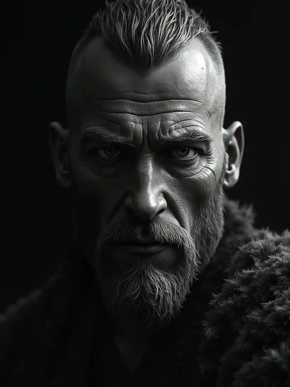 Un visage [Viking Warrior] sur fond noir, dans un style illustré ultra-réaliste, blanc clair et argent foncé, contraste clair-obscur, art de la bande dessinée noire, peinture monochrome, regard intense --ar 3:2