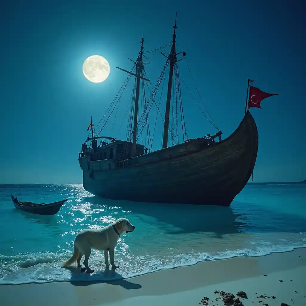 Le bateau Viking s'est échoué dans les eaux bleues et claires d'une plage des Bahamas, dans une nuit de pleine lune. Des chiens maltais se faufilaient dans le bateau. Le groupe de dauphins s'arrête pour voir le chien à bord. Freddy cheveux courts et homme blond est également sur le pont.