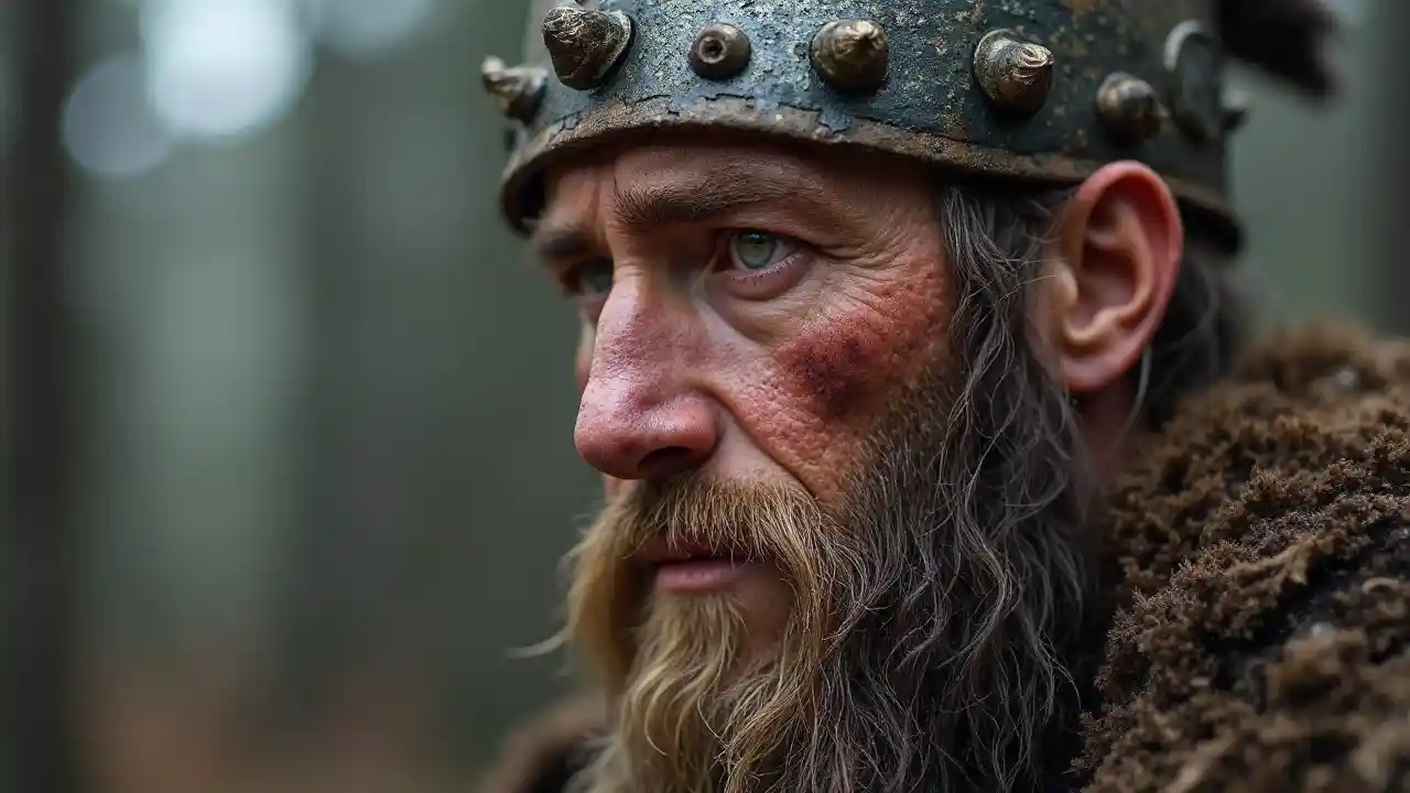 Un guerrier viking, semi-latéral, visage ridé, yeux marron brillants, peau altérée, hautement méticuleux, laque de combat, chapeau de combat,