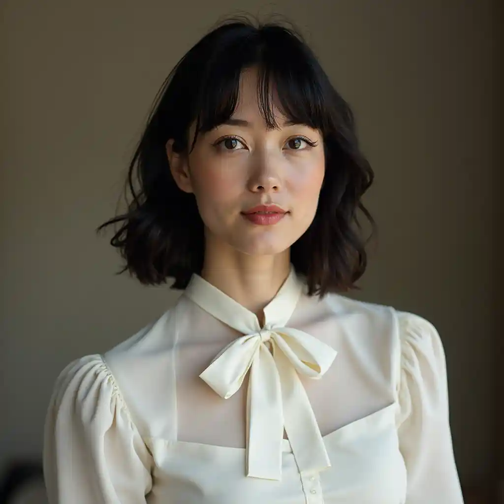 La mère de 35 ans portait des cheveux noirs jusqu'aux épaules et portait un col en nœud blanc rétro, avec une photo spéciale de son corps.