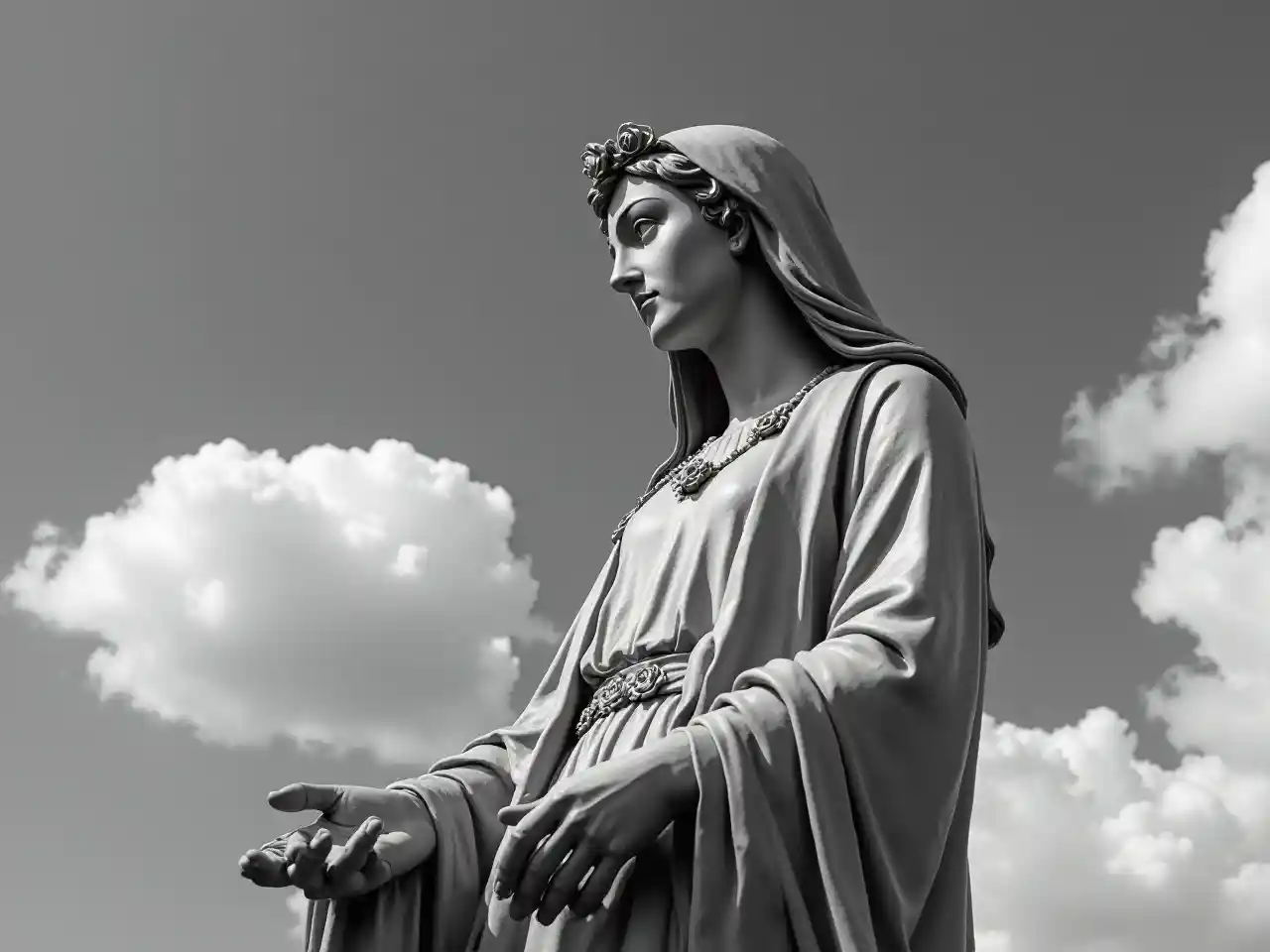 Marie, la vierge qui regarde de côté, tient un collier rose dans le ciel, noir et blanc