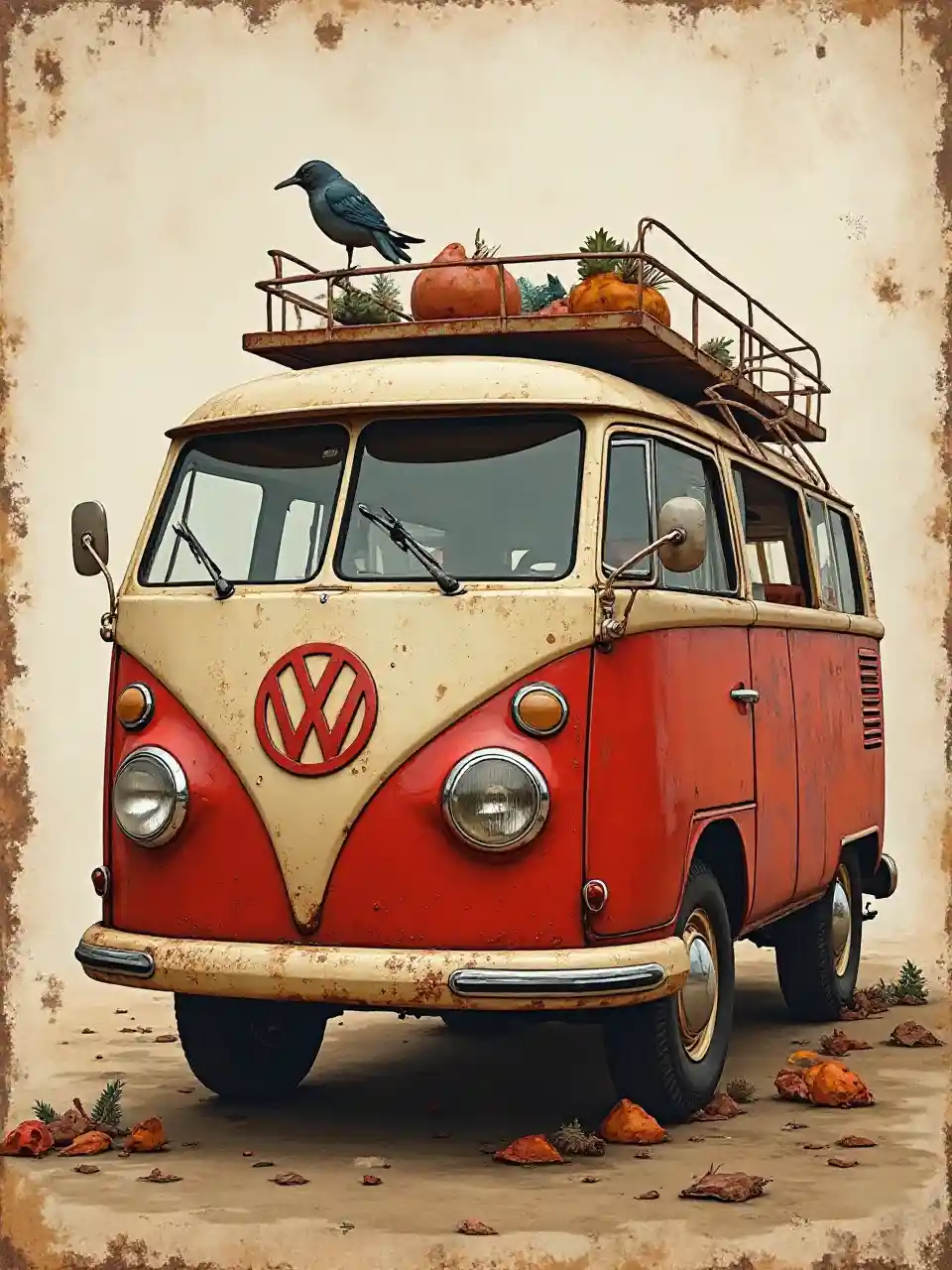 Bus populaire, art de la toile, imprimerie d'art abstrait, dans le style de Brian Mashburn, rouge clair et marron clair, Prince Théo, illustrations de personnages charmants, Pierre Pellegrini, clip rétro, fragments rouillés --ar 73:92--stylize 750--v 6