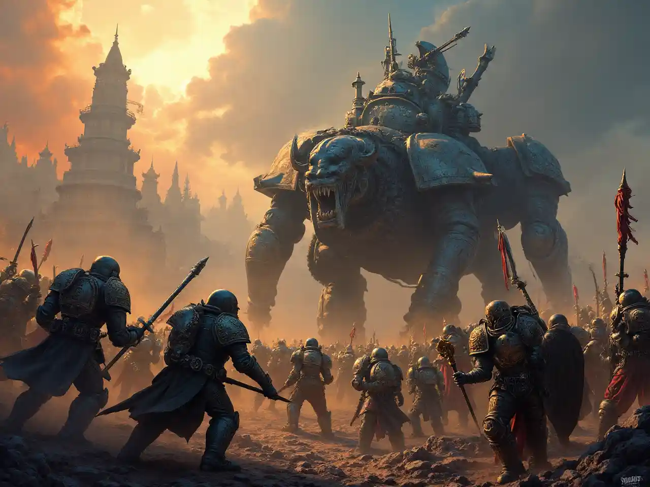 (indice d'octane élevé) Scènes de marteau de guerre, représentations épiques de batailles, couleurs vibrantes, atmosphère tendue, détails complexes, montrant des personnages et des véhicules emblématiques de marteau de guerre, armes et équipements détaillés, contrastes vifs, postures d'action dynamiques, paysages de fond bruyants, esthétique fantastique et sombre, vastes champs de bataille, éléments mythiques, ultra-détaillés, savoir-faire dans l'armure et le design, énergie narrative fascinante, Héros et personnages maléfiques s'entrechoquent dans une lutte acharnée.