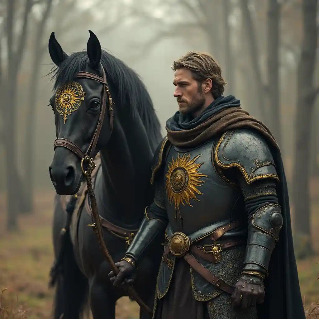 HenryWarhammer, vieux monde, fantaisie, aristocratie debout à côté de son cheval, cheval vêtu d'une armure noire avec un soleil doré ou jaune sur l'armure, cheval sans cavalier