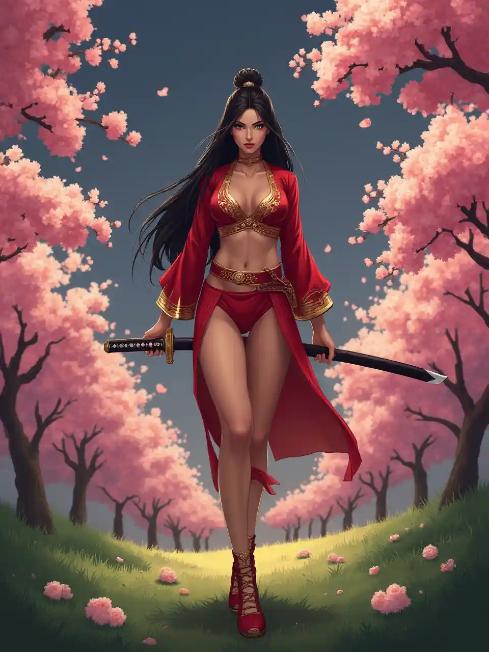 L'illustration numérique prise du point de vue de la caméra latérale raconte l'histoire d'une femme guerrière féroce vêtue d'un costume rouge et doré et armé d'un katana. Le fond est un cerisier en fleurs et un ciel sombre. Une femme apparaît également sur l'image. Elle a l'air d'avoir une vingtaine d'années, avec de longs cheveux noirs et une expression ferme, debout sur une jambe et tenant un katana dans les deux mains. Elle porte un costume rouge, doré et blanc avec un décolleté bas, un grand physique, un corps mince et une forme physique. Et elle a une posture affirmée et puissante. La femme est positionnée au centre de l'écran et son corps entier est visible du point de vue de l'objectif. Le fond est caractérisé par des prairies verdoyantes et des fleurs de cerisier en fleurs, créant une atmosphère paisible et romantique. La lumière est douce et chaleureuse, soulignant les courbes des femmes et les subtilités des détails vestimentaires.