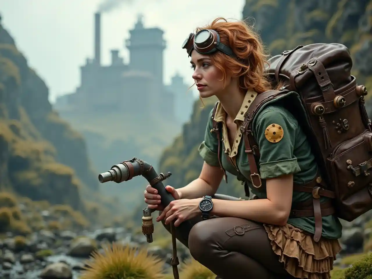 Le portrait d'une jeune guerrière vêtue d'un costume de guerrier, de cheveux roussi ondulés et de lunettes de pilote en cuir a été poussé, un haut à manches courtes en toile vert forêt avec des rivets en cuivre et un col décoré crème avec pignon, une minijupe à feuilles de lotus en cuir marron avec des boucles empilées, ajustant la vanne sur le sac à dos à vapeur, accroupi à côté de la machine à vapeur sifflante, regardant vers une immense usine émettant une épaisse fumée, à sa gauche, Un immense bâtiment se profile dans la ville antique. Une mise au point douce, entourée de perspectives floues et d'arrière-plans floues, au loin se trouvent des montagnes rocheuses et enfumées, Les ailes d'oiseau volent dans la brume, des mousses vertes résistantes et des champignons métalliques poussent sur les machines rouillées, et divers outils et manomètres sont attachés à ses vêtements, avec une clé lourde à la main.