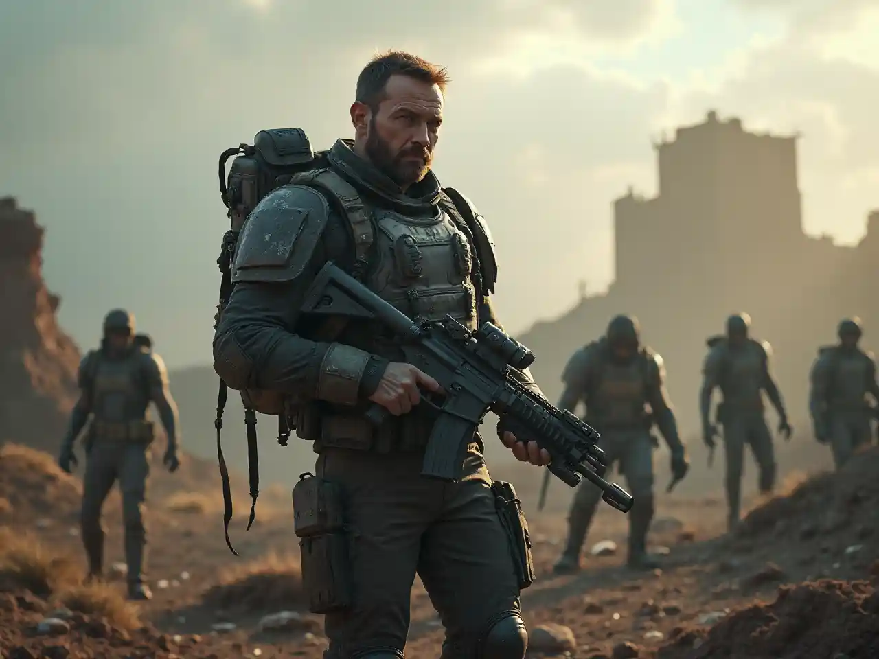 Un homme de terrain sauvage portant une armure de guerre futuriste, carabine et couteau de combat à la main, entouré de zombies menaçants et de zombies mutants, atmosphère tenace, paysages apocalyptiques, arrière-plan désolé de ruines et de débris, lumière dramatique Jetant des ombres étranges, tendue et pleine d'action atmosphère, qualité ultra-détaillée, 4K, capturez le chaos et l'instinct de survie du monde post-apocalyptique.