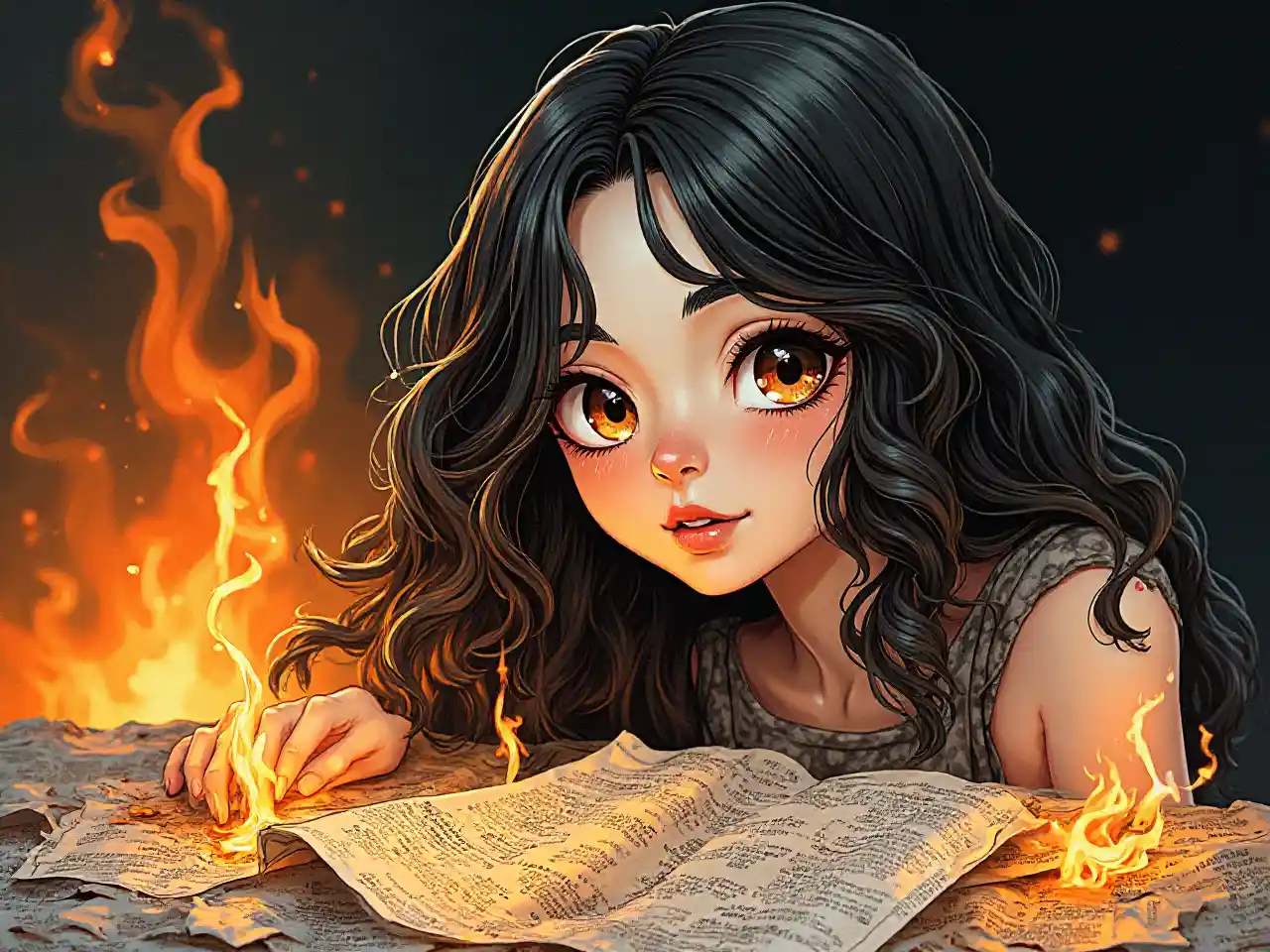 Les illustrations fantaisistes (((noir et blanc et flamme orange)), combinées (pointillées et combinaisons claires et détaillées (motifs et textures), émettent (une lumière subtile, onirique) sur fond de (peau extrêmement détaillée et réaliste), dépeignent une (belle femme pâle), (grands yeux expressifs) encadrée par (cheveux longs et ondulés), Sur un fond (teinte orange et noire) contraste avec celui du tableau ci-dessous (surface plissée, texturée (semblable à un journal)), où la posture du corps est parfaitement complémentaire à la composition