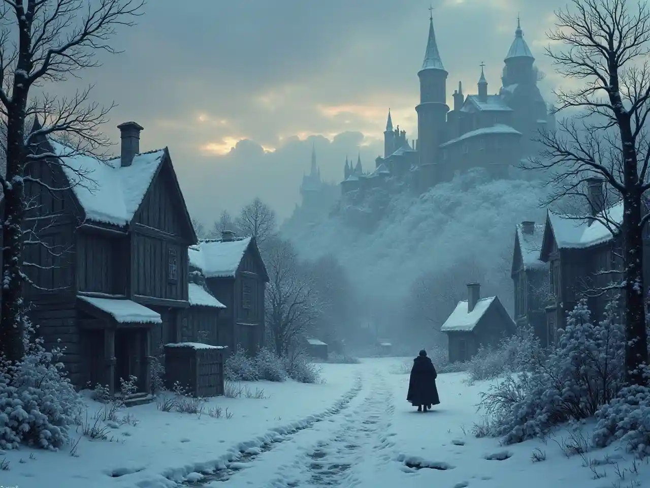 Ville d'hiver sombre et fantastique au Moyen Âge