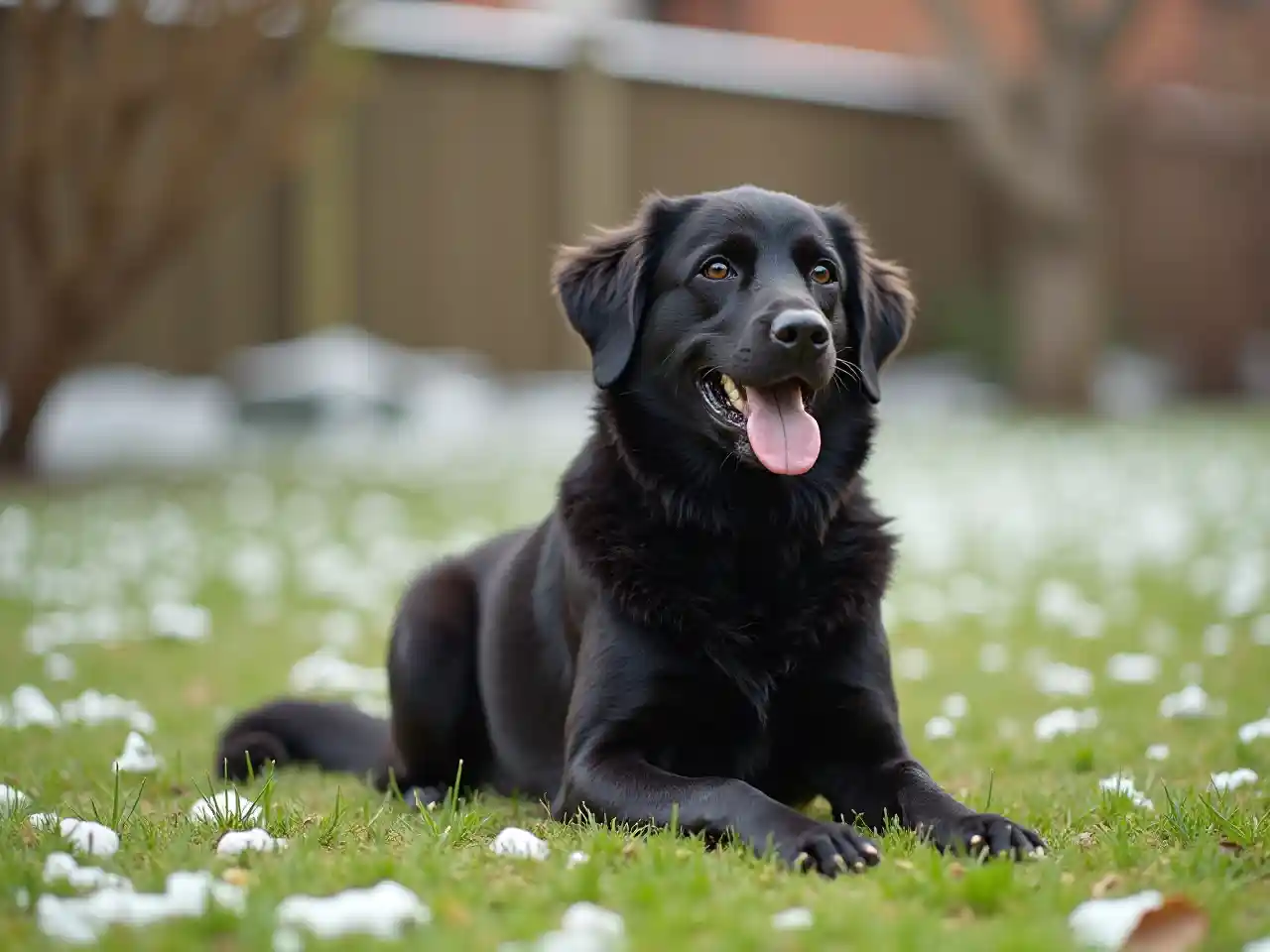BenjaminUn chien noir assis sur la prairie d'un petit jardin anglais. Un hiver avec de la neige au sol. Vu du terrain.