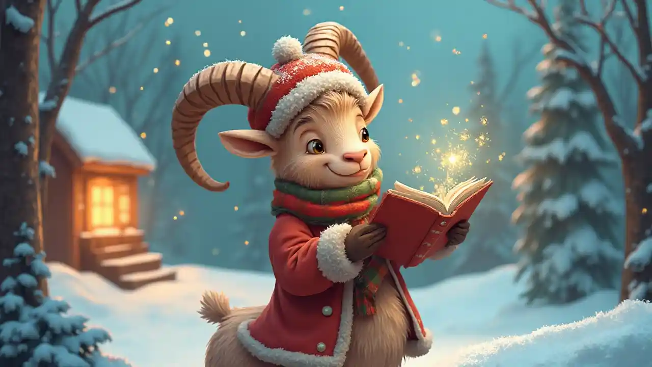 AdalynUn bélier de dessin animé en tenue d'hiver et chante une ode avec un livre de musique