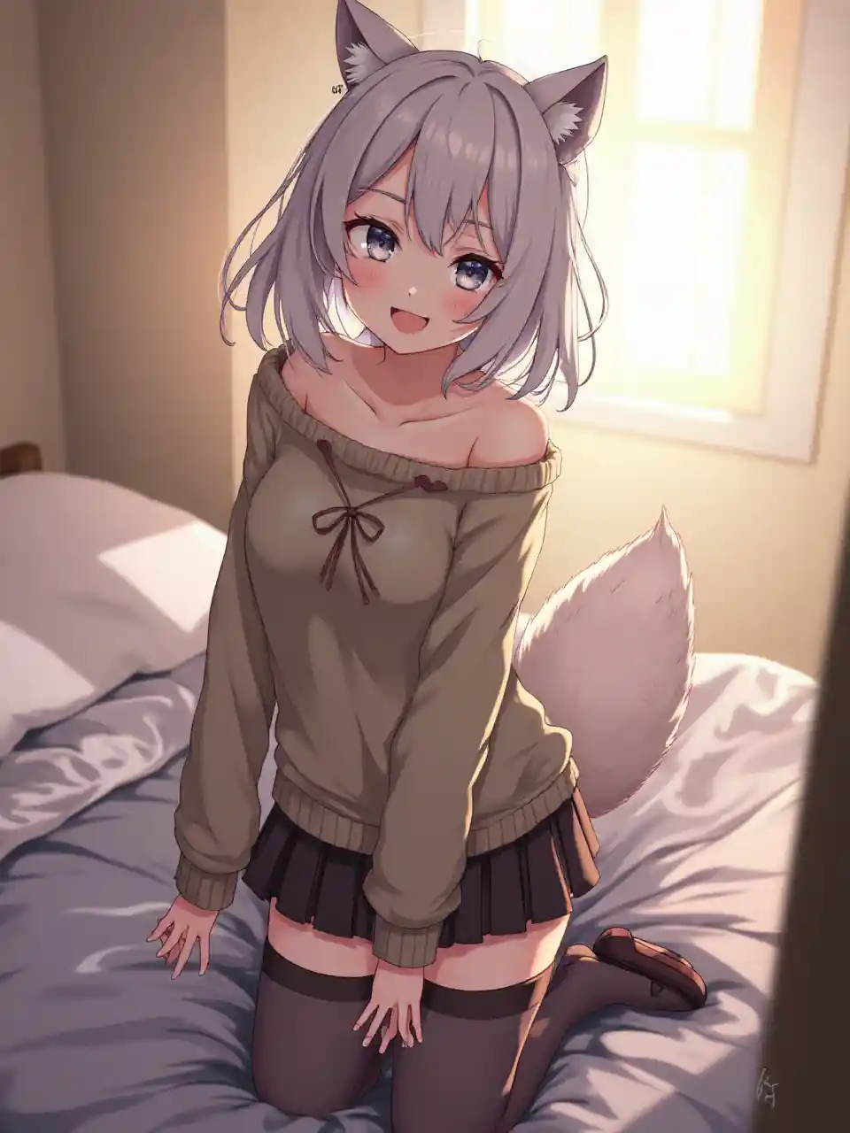 (Chef-d'oeuvre, qualité optimale, ultra-haute résolution, absurde: 1,1), très esthétique, éclairage de cinéma, (éclairage de volume: 1,1), HDR, lancer de rayons, détails réalistes, tendances des stations d'art, ultra-haute définition 8K, hautement détaillé, détails complexes, peinture numérique, art conceptuel, anatomie parfaite, visage symétrique, belle composition, éclairage dynamique, lumière douce, couleurs vives, regarder le public, solo, Break, 1girl, kemonomimi, louve, queue moelleuse, cheveux argentés mi-longs, barrette mignonne, Variations sur l'uniforme scolaire, jupe plissée courte, pull à épaule décollée, cuisse rayée, chaussures Lefa, Pose coquine, clins d'œil, sourires provocateurs, expressions ludiques, fond de chambre confortable, Soleil matinal chaud, charme décontracté, petites dents pointues, fard à joues léger, mignon diabolique, lumières douces, teintes douces, réglages décontractés,