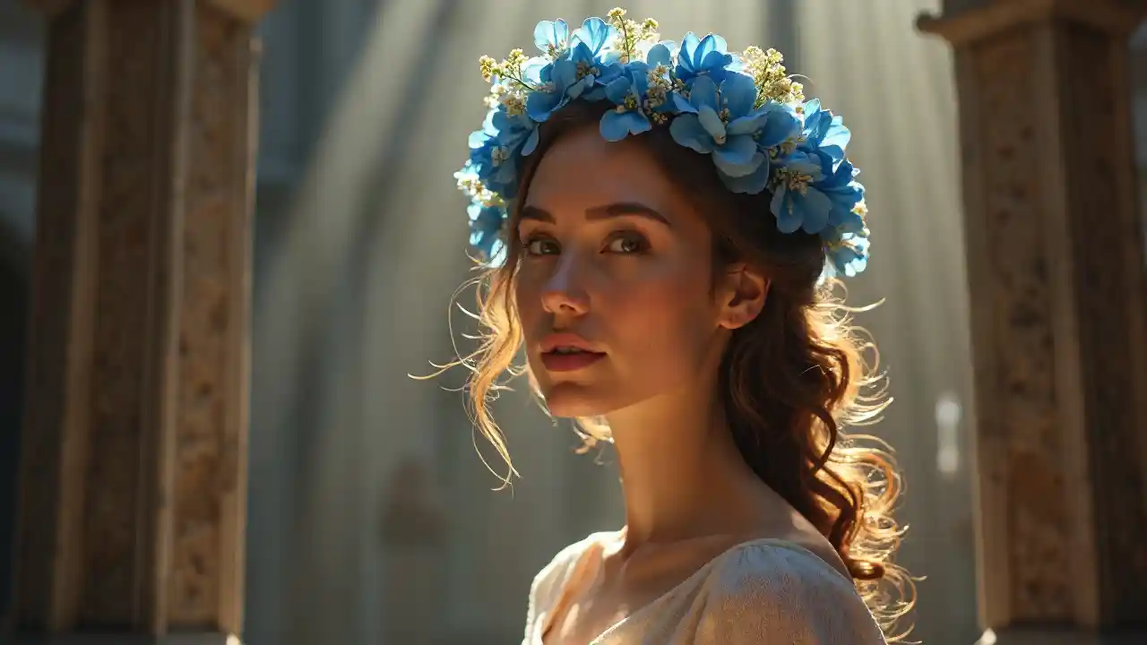Portrait de beauté de la couronne bleue, grand intérieur de cathédrale gothique, lumières dramatiques, détails incroyables, style romantique Art, architecture, soleil, couleurs saturées