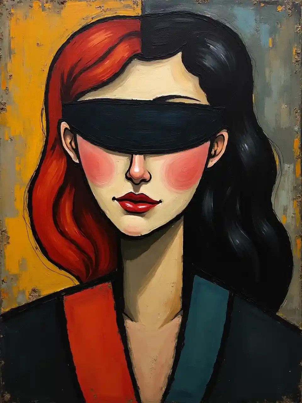 ANNAPortrait de femme cubiste Pablo Picasso look, cheveux longs avec masque oculaire, rouge et noir