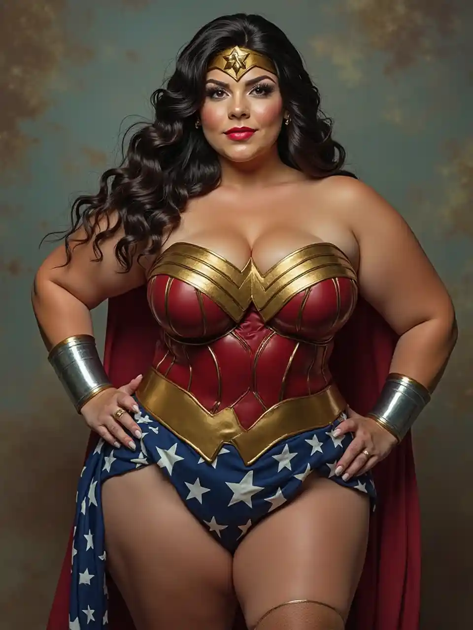 Une jolie grosse femme en costume de Wonder Woman, un décolleté géant et une cuisse épaisse