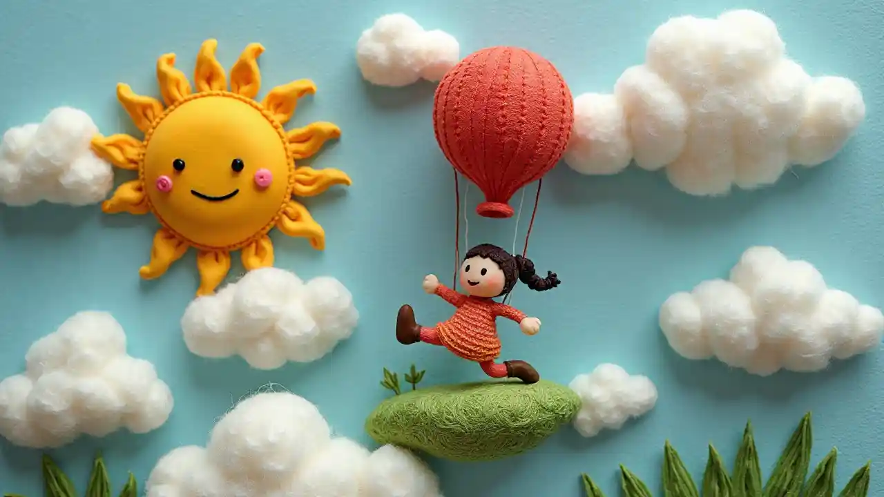 Texture de livre tridimensionnelle faite à la main, petite fille tissée de laine volant dans une montgolfière en pâte à modeler, l'arrière-plan est une île de nuages flottants en feutre et un visage souriant cousu avec des boutons, conservant délibérément les traces de mise en forme de pâte à modeler et les fins plis de fibre de laine, 8k