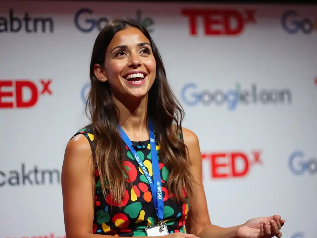 Il s'agit d'une photo d'une jeune femme prenant la parole lors d'un événement. Elle se tenait devant un fond avec des logos et du texte, y compris le logo rouge "TEDX" et le logo blanc "Google". Elle porte de longs cheveux noirs, droite et élégante, un sourire chaleureux, qui respire la confiance et l'enthousiasme. Sa peau est chaude, claire et olive, ses sourcils et ses cils sont soigneusement coiffés. Ses yeux sont en forme d'amande et de couleur foncée, avec un maquillage subtil, soulignant sa beauté naturelle. Elle porte un haut coloré sans manches avec des motifs abstraits vibrants de diverses formes et couleurs telles que le rouge, le vert, le bleu et le jaune. Elle portait une corde bleue autour du cou et une plaque avec la mention « Google » en lettres blanches indiquant qu'elle était affiliée à cette société. Elle tenait un micro argenté à la main droite près de sa bouche, laissant entendre qu'elle s'exprimait positivement. Sa main gauche est visible et elle tient une partie de la corde de suspension. Le fond est un mélange de blanc et de rouge, avec divers logos et textes, désignant une activité formelle ou professionnelle. La lumière est vive, elle et l'objet au premier plan sont mis en valeur, tandis que l'arrière-plan reste légèrement flou. < lora:MarinaA:0.61 >