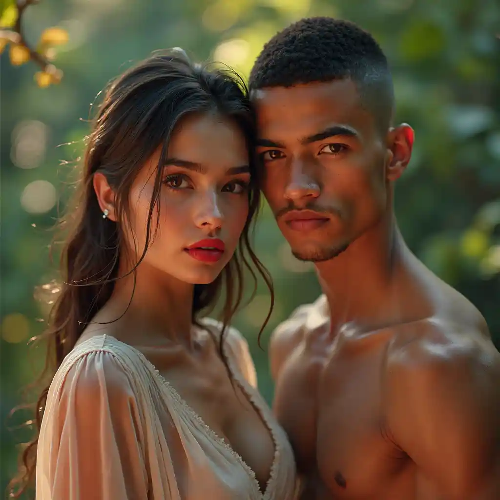 Une image très charmante représente une jeune femme aux traits accrocheurs, dont les lèvres sont élégamment peintes dans un ton rouge vibrant qui complète son manteau léger, transparent et transparent. Cette scène a été soigneusement capturée dans une photo haute résolution, capturant les lumières et les textures complexes et ultra-réalistes de la nature. Le jeune homme se tient à ses côtés, son physique musclé et athlétique est accentué par ses cheveux courts et sa silhouette modeste mais clairement athlétique. Il respire le charme de la jeunesse dans une posture assurée, le regard direct sur la caméra. Un éclairage coloré fort et vif projette une lumière douce, mettant en valeur les détails ultra-réalistes de la scène, tandis que des textures naturelles et saines contribuent à son authenticité.