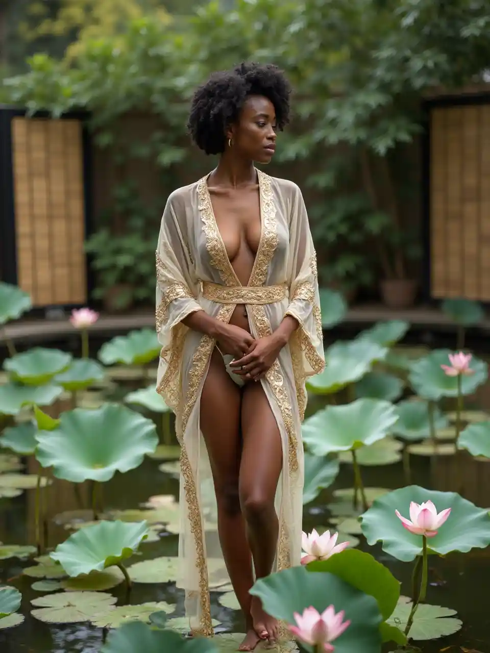 Une femme noire de 25 ans prend la pose dans un jardin zen rempli de fleurs de lotus, vêtue d'un pur kimono avec des broderies dorées, qui fascine. L'étang koi et l'écran en bambou l'encadrent, et ses jambes en forme et son design décolleté dégagent une élégance paisible et un charme attrayant dans un environnement paisible et traditionnel.