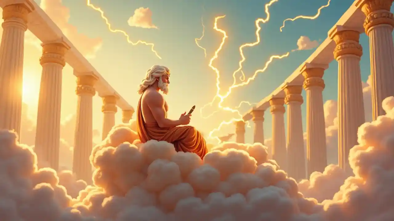 Pour créer cette image dans le style de Pixar en 4k: Fantasy Illustrations, Zeus est assis sur une nude dorée, avec des éclairs doux à ses côtés, et écrit la liste des animaux avec un stylo à plumes lumineux. Le fond est des piliers grecs classiques, avec des nuages doux dans le ciel lumineux, atmosphère sacrée, soleil chaud, style de livre de histoires, hautement détaillé, couleurs douces