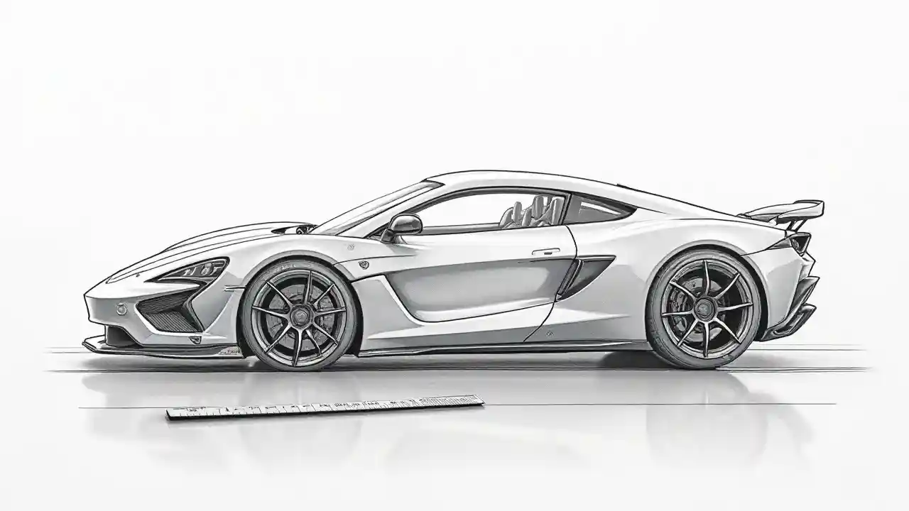 सफेद पृष्ठभूमि पर एक स्पोर्ट्स कार का एक रेखाचित्र जिसके सामने एक शासक है और एक स्पोर्ट्स कार का एक रेखाचित्र, एंड्रीज स्टॉक, सुपरफ्लैट, अत्यंत विस्तृत, एक विस्तृत रेखा