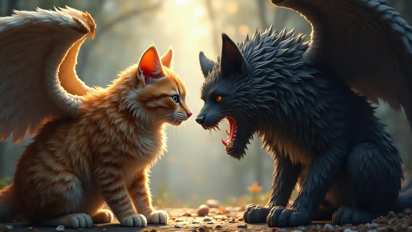 graceसबसे अच्छी गुणवत्ता, जटिल विवरण, अल्ट्रा विस्तृत, स्वर्गदूत बिल्ली और नरक के कुत्ते, संघर्ष के बारे में, एक दूसरे को घूर, बिल्ली दोस्त और जिज्ञासु है,