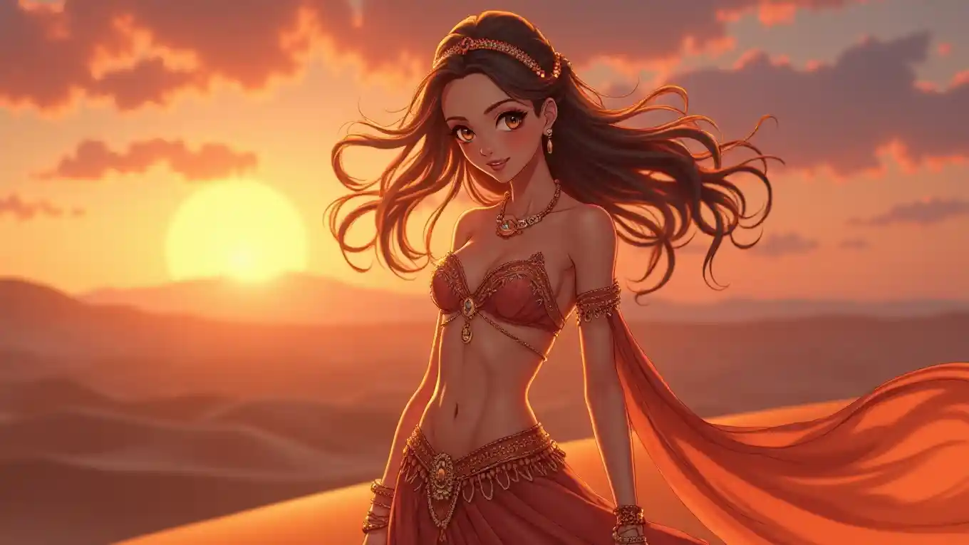 अल्ट्रा एचडी एनीमे लड़की की क्षैतिज बड़े पैमाने पर छवि, चमकदार और रोमांचक, दोपहर में चमकती है, रंगीन सूर्यास्त के साथ एक रेगिस्तान चट्टान पर खड़ी है, एक गहरी गर्दन और पारदर्शी घूंघट के साथ एक बहती पेट नर्तक पोशाक पहनती है, उसके लंबे बाल हवा में नृत्य और एक गर्म मुस्कान, चौड़ी चमकती आंखें, गर्म सोने और नारंगी रंग पैलेट, नाजुक विशेषताएं, सही मेकअप, विदेशी और रोमांचक वाइब्स, नरम चमक और प्राकृतिक प्रकाश, एक सूक्ष्म cleavage के साथ उसके सुरुचिपूर्ण, अच्छी तरह से परिभाषित छाती पर जोर देता है, और एक सुरुचिपूर्ण मुद्रा के साथ लंबे, टोन किया गया पैर, सुंदरता और रहस्यमय।