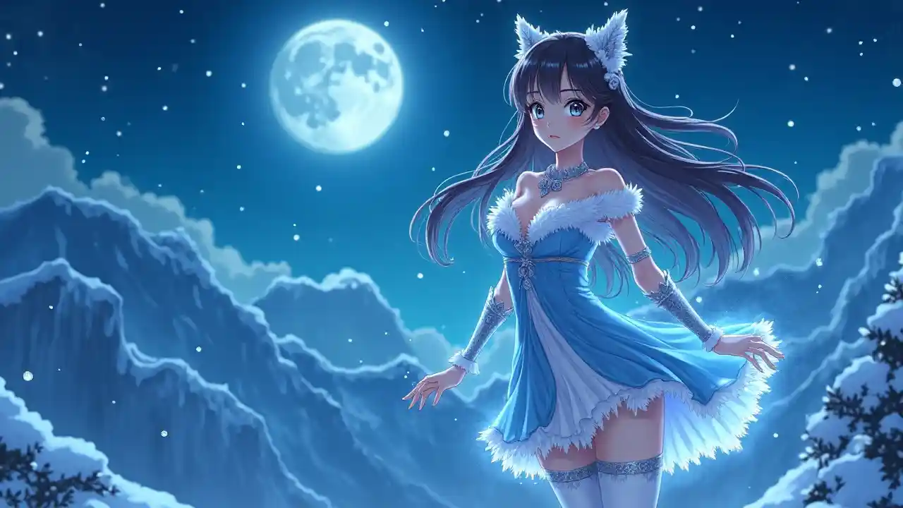 अल्ट्रा एचडी एनीमे लड़की की क्षैतिज बड़े पैमाने पर छवि, आश्चर्यजनक रूप से भव्य और आकर्षक, पूर्ण चंद्रमा के नीचे चमकती है, एक बर्फ की चट्टान पर बाहर खड़ी है, जिसमें एक तंग गर्दन और जांघ तक की मोज़ाओं के साथ एक फर-लाइन पोशाक है, उसके लंबे बाल ठंढ से चमकते हैं और एक शांत मुस्कान, बड़ी चमकती आंखें, चमकती त्वचा, बर्फ का नीला और चांदी रंग पैलेट, तेज लुक, निर्दोष मेकअप, जादुई और शांत वाइब्स, नरम चमक और परिवेश प्रकाश, एक सूक्ष्म डिले, और एक संतुलन के साथ लंबे, स्पष्ट पैरों को प्रदर्शित करती है।
