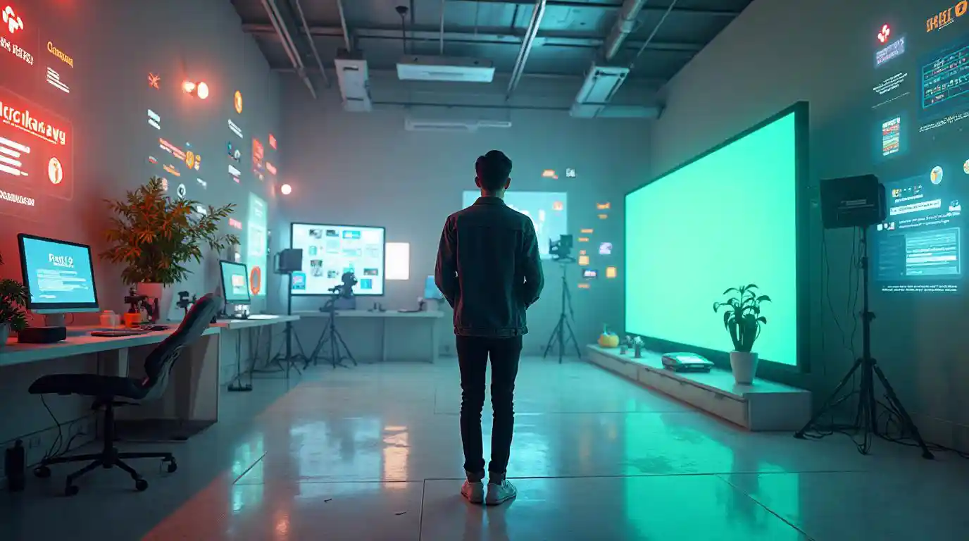 शीघ्रः सरियल प्रोफेशनल आर्टिस्ट का स्टूडियो "एक तरल, खुले स्थान में एक उच्च अंत, इमर्सिव कलाकार के स्टूडियो को डिजाइन करें जो व्यावसायिकता और असीमित रचनात्मकता को याद दिलाता है। कमरा जीवित महसूस करता है, एक कला स्टूडियो के वातावरण को एक चिकना, डिजिटल संस्कृति संग्रहालय के साथ मिलाता है। यह स्थान प्राकृतिक रूप से घुमावदार होता है, तेज कोणों से बचता है और प्राकृतिक प्रवाह पैदा करता है। स्टूडियो क्षेत्रः डिजिटल आर्ट और यूआई कॉर्नर: एक भविष्यवादी डिज़ाइन क्षेत्र जो फ्लोटिंग यूजर इंटरफेस घटकों से भरा है - वेबसाइट बटन स्लाइडर और टेक्स्ट बॉक्स। चमकते पीसी और टैबलेट ग्राफिक डिजाइन परियोजनाओं और एआई द्वारा उत्पन्न कला प्रदर्शित करते हैं। यूआई तत्व चारों ओर तैरते हैं, एक चिकनी, पॉलिश तरीके से दृश्य में एकीकृत होते हैं। वीडियो और ग्रीन स्क्रीन जोन: कैमरे अपने स्टैंड के ऊपर थोड़ा तैरते हैं, और केबल ऊर्जा से झूमते हैं। हरी स्क्रीन बदलती वास्तविकताओं के साथ चमकती है, डिजिटल उत्पादन की निरंतर गति और सटीकता को पकड़ती है। मध्य चित्रः मुख्य पात्र - पीछे से देखा गया एक व्यक्ति, कैमरे के करीब - अंतरिक्ष में केंद्रित है। वह एक काली जींस जैकेट, काली जींस और इंडी वाइब के साथ सफेद जूते पहनता है। उनके छोटे काले बाल एक तरफ धकेल दिए गए हैं, जिससे रचनात्मकता और व्यावसायिकता का संचार होता है। वह अपने आसपास की तकनीक से सक्रिय रूप से जुड़ता है, जो परस्पर और जीवित महसूस करता है। यूआई घटक उसके चारों ओर तैरते हैं, डिजाइन उपकरणों के साथ उसके संबंध का प्रतीक है। मनोदशा एवं पर्यावरण: समग्र वातावरण एक कलाकार के स्टूडियो की जीवंतता को एक उच्च अंत डिजिटल संग्रहालय के स्वच्छ, भविष्यवादी डिजाइन के साथ जोड़ता है। यह वातावरण व्यवस्थित, पेशेवर और सटीक लगता है, जिसमें निरंतर गति और कल्पना की भावना होती है। उत्पादन उपकरण और डिजिटल उपकरण कला और प्रौद्योगिकी का एक निर्बाध मिश्रण बनाते हुए, सुरुचिपूर्ण रूप से तैरते हैं। दृश्य फोकसः कैनन ईओएस आर5 और 50 मिमी एफ/1.4 लेंस के साथ हर विवरण को कैप्चर करें