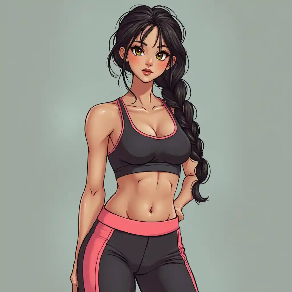 Madelynस्पोर्ट्स लेगिंग और ब्रा में पतली आकृति वाली लड़की, काले बाल, उज्ज्वल रंग, स्पष्ट विवरण