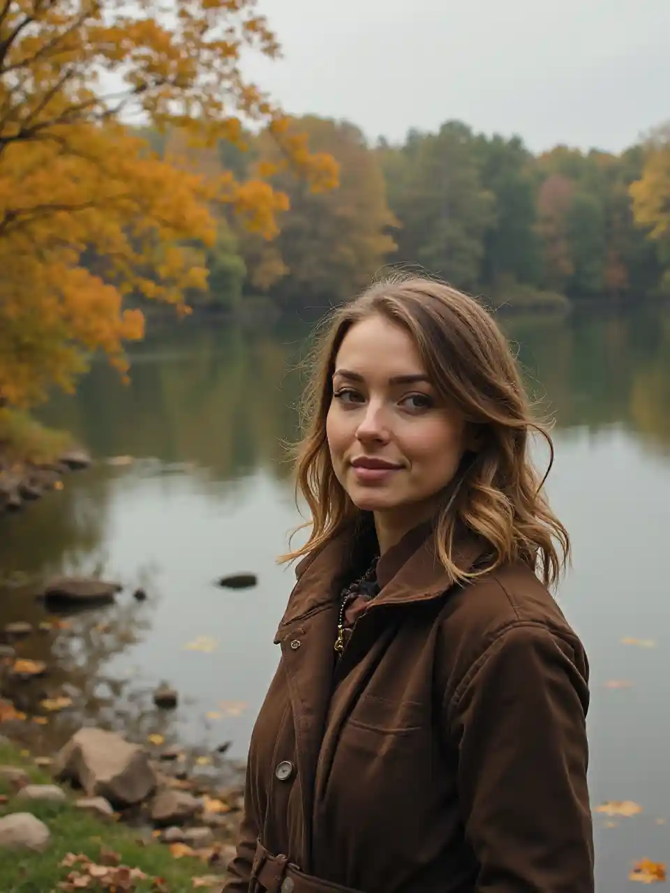 Giselleशरद ऋतु, झील के पास सुंदर महिला