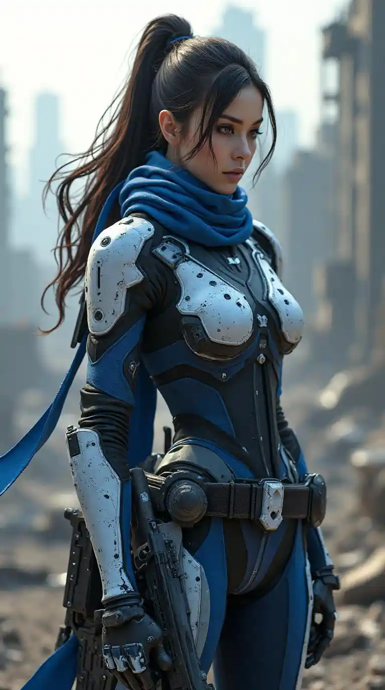 "एक क्रूर महिला निंजा मैक, एक पूर्ण शरीर नीले और सफेद भविष्यवादी कवच में कवर, उसके कमर पर एक भारी AWP राइफल के साथ। उसके लंबे, चिकने काले भूरे बाल एक स्टाइलिश पोनीटेल में बंधे हैं जो हवा में नाटकीय रूप से बहते हैं, जो पृष्ठभूमि में युद्ध से तंग शहर के विपरीत है। एक नीली स्कार्फ भी हवा में तेज लहर कर रही है, जिससे दृश्य में एक स्पर्श होता है। निंजा का चेहरा ठंडा और भावहीन है, जिसमें घातक सटीकता और सूक्ष्म भय का आभास है, लेकिन अनुग्रह का एक संकेत है। यह दृश्य 16K रिज़ॉल्यूशन में कैद किया गया है, जिसमें डिजिटल रिफ्लेक्स कैमरा प्रभाव और प्रकाश अनुरेख इस सिनेमा के समग्र गुणवत्ता को बढ़ाता है। वातावरण को स्पष्ट अंधेरे प्रकाश से बढ़ाया गया है, जो एक्शन से भरी, कॉन्सेप्ट-आर्ट से प्रेरित रचना में गहराई और नाटक लाता है। इस मेक का डिज़ाइन चिकनी यांत्रिक तत्वों को एक्शन पेंटिंग के कलात्मक स्पर्श के साथ जोड़ता है, जिससे इसे लालित्य और शक्ति की भावना मिलती है। पूरी सेटिंग 3 डी डिजाइन की एक उत्कृष्ट कृति है, जिसमें एक तबाह शहर का दृश्य पृष्ठभूमि के रूप में है, जिसे फिल्म शैली की रोशनी द्वारा उजागर किया गया है जो नीले और सफेद कवच और युद्ध से पीड़ित परिवेश के बीच के विपरीत है। सामान्य मनोदशा में खतरे की भावना और मृत्यु का एक सूक्ष्म भय मिला हुआ है, जो 0.5 पर संतुलित है, जो कि हत्यारे के मृत्यु के बारे में अधिक है। नीले रंग के गेमिंग गियर ने उसकी उपस्थिति में एक भविष्यवादी बढ़त डाली है, जिससे वह इस पोस्ट दुनिया में एक घातक आंकड़ा बन गई है।