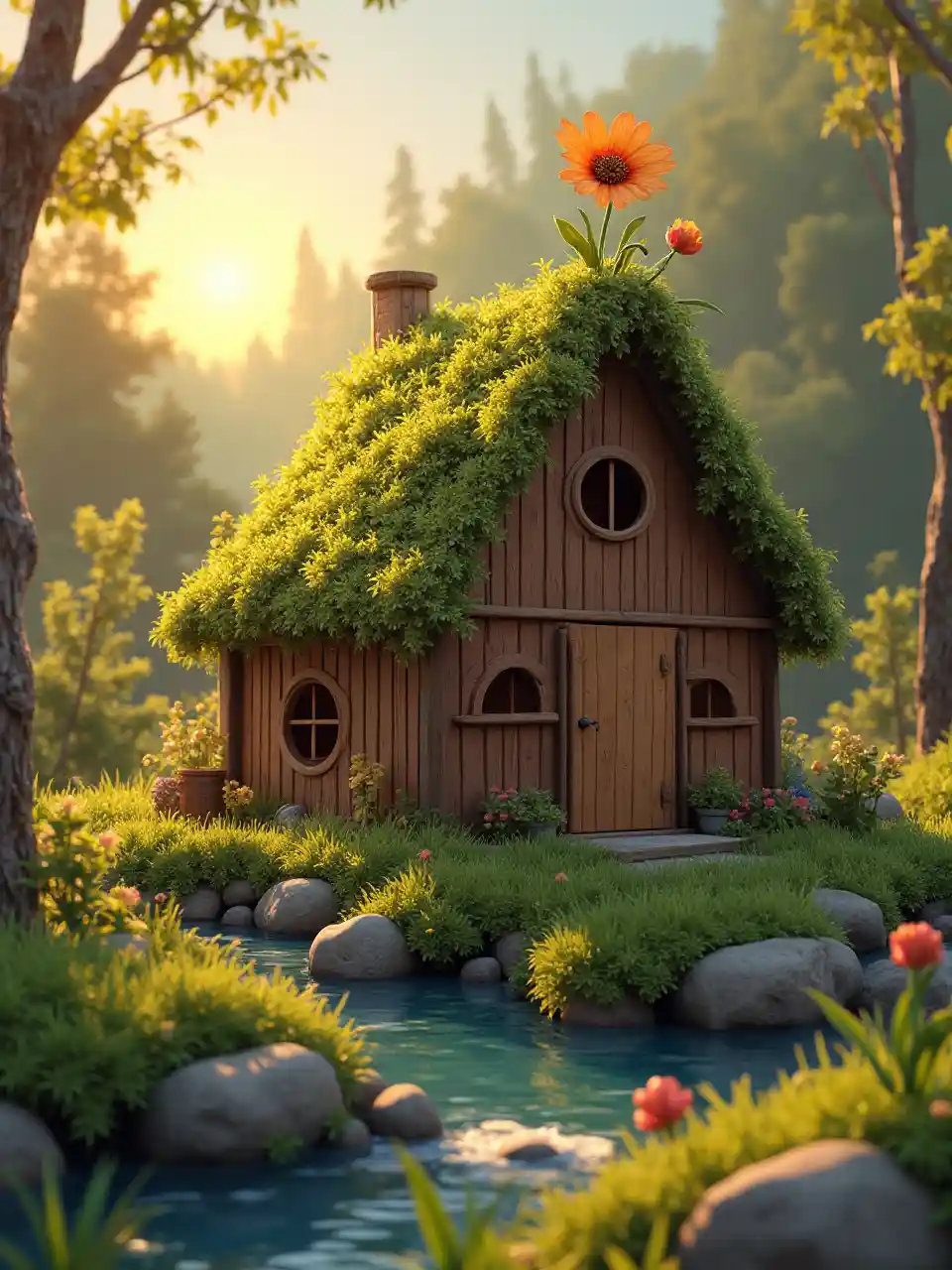 Auroraसमाप्त बिच्छू-बंगला घास भरी धारा के किनारे गर्व से खड़ा है। छत झाड़ू से ढकी हुई है, और उसमें से एक फूल उग रहा है। यह आरामदायक और स्वागत लग रहा है. सूरज डूबने लगा है, जो एक गर्म सुनहरी चमक रहा है।