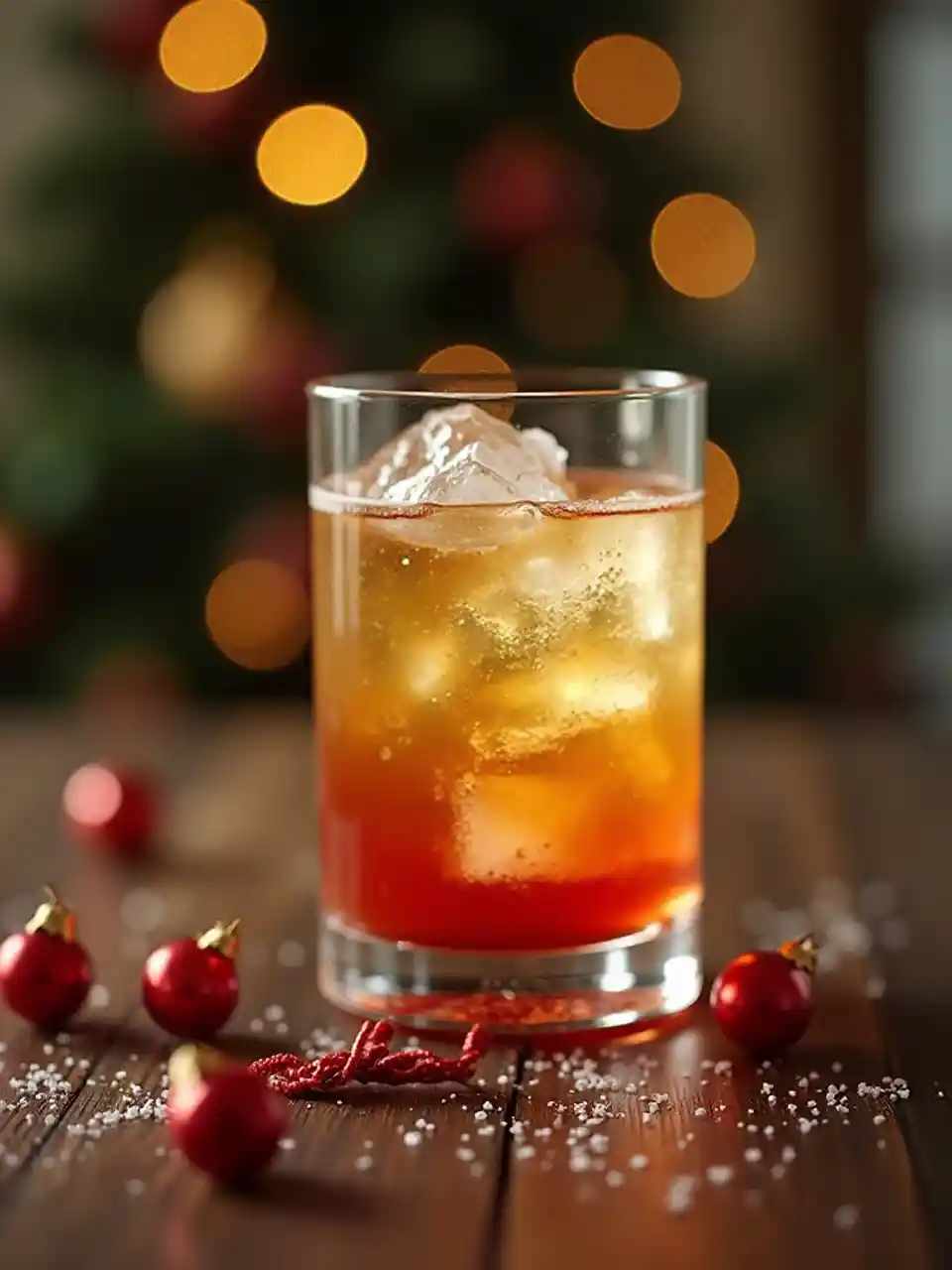 कॉकटेल; हाईबॉल ग्लास; लकड़ी की मेज; बहुत धुंधली क्रिसमस पृष्ठभूमि;