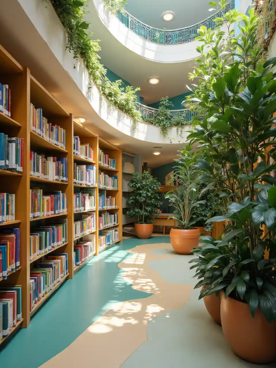 हरियाली और रंगीन डिजाइनों से भरा हाई स्कूल का पुस्तकालय