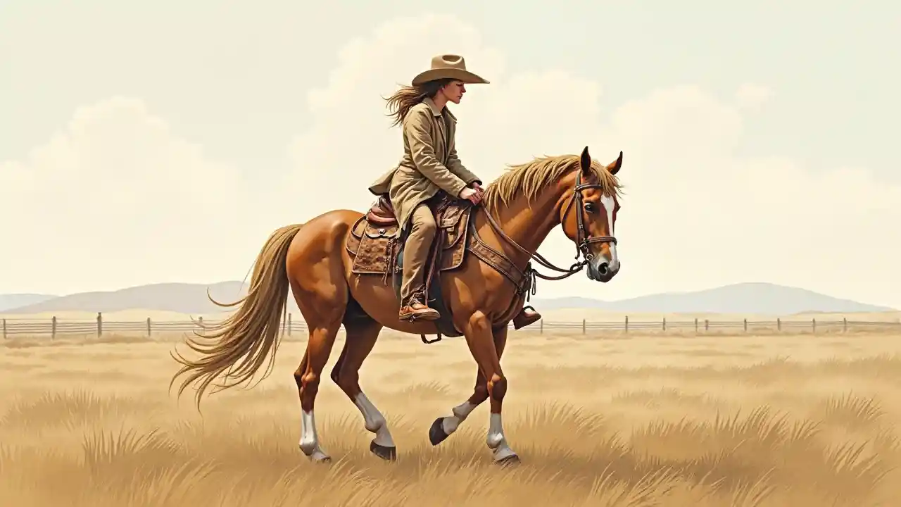Davidघोड़े पर सवार एक महिला को चित्रित करें वह एक गाय लड़की के रूप में पहने हुए एक लंबे कोट वह घेर लिए हुए मैदानों में है यह एक सुंदर दृश्य है