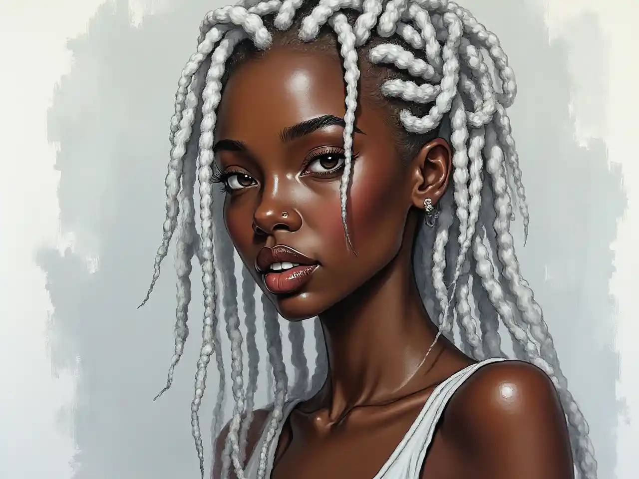 गहरी गहरी त्वचा वाली अफ्रीकी अमेरिकी महिला, सफेद ड्रेडॉक्स, आमंत्रित नज़र, सफेद होंठ, सुंदर आँखें, सफेद शरीर का उपयोग, चांदी के रंग की पृष्ठभूमि, कागज पर खींची
