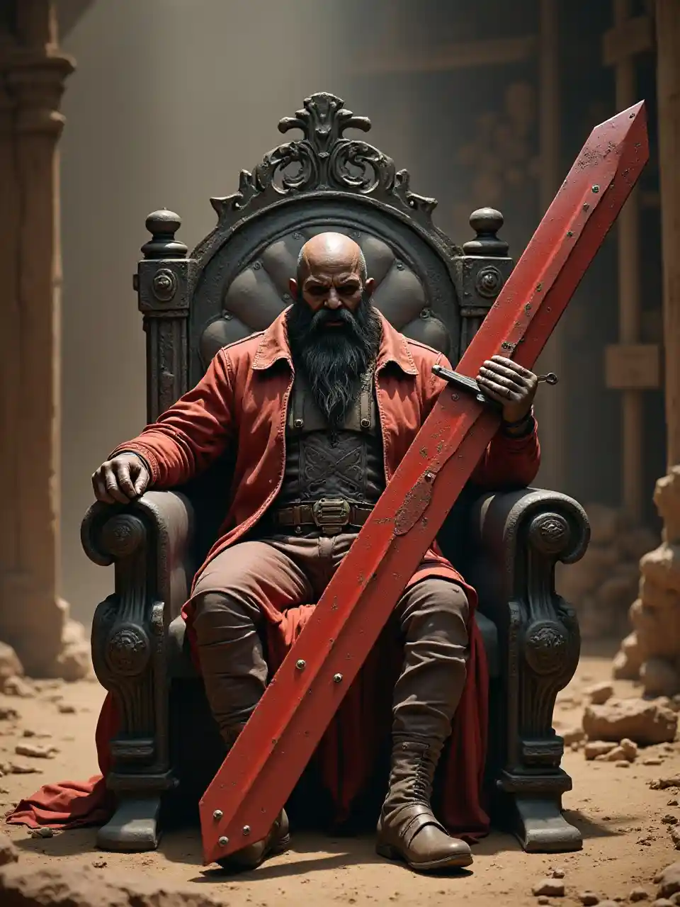 एक रेगिस्तान के गोदाम में एक इस्पात सिंहासन पर बैठे डाकू राजा के मालिक, एक बड़ी लाल इस्पात greatsword के साथ