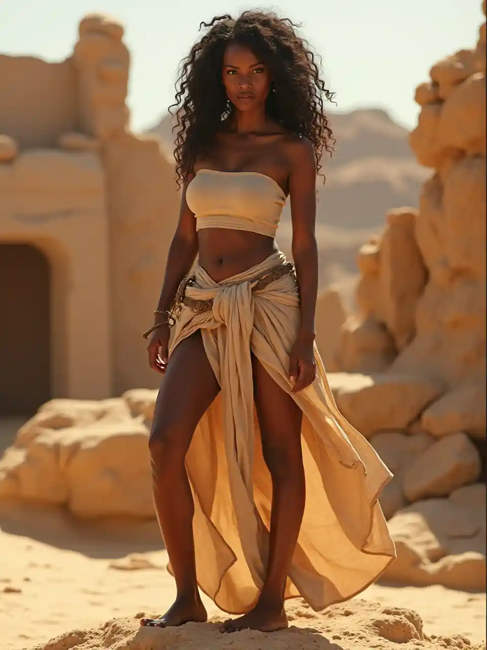 गहरी इबोनी त्वचा वाली एक बहुत ही सुंदर महिला, जो कि युवा और धूप से चमकती है। उसका एथलेटिक, घुमावदार और पतला शरीर बिल्ली की तरह सुंदरता से चलता है। उसके पूर्ण, प्राकृतिक लाल होंठ उसकी त्वचा के विरुद्ध स्पष्ट रूप से खड़े हैं। वह एक कट-अप रेगिस्तान पहने हुए लिनन टॉप में है - तंग और सांस लेने योग्य - एक लंबी, फ्लोटिंग पट्टा जैसी स्कर्ट के साथ उपयोगिता बेल्ट और हल्के लिपटे हैं। वह एक धूप से सफ़ेद खंडहर के ऊपर पोज दे रही है, सुनहरा रेगिस्तान सूरज उसके शक्तिशाली पैरों को प्रकाश और प्राचीन पत्थर पर बोल्ड छाया है। रेत उसके चारों ओर धीरे घूमती है, जिससे उसके आत्मविश्वास और भयंकर, रहस्यमय अभिव्यक्ति पर जोर मिलता है।