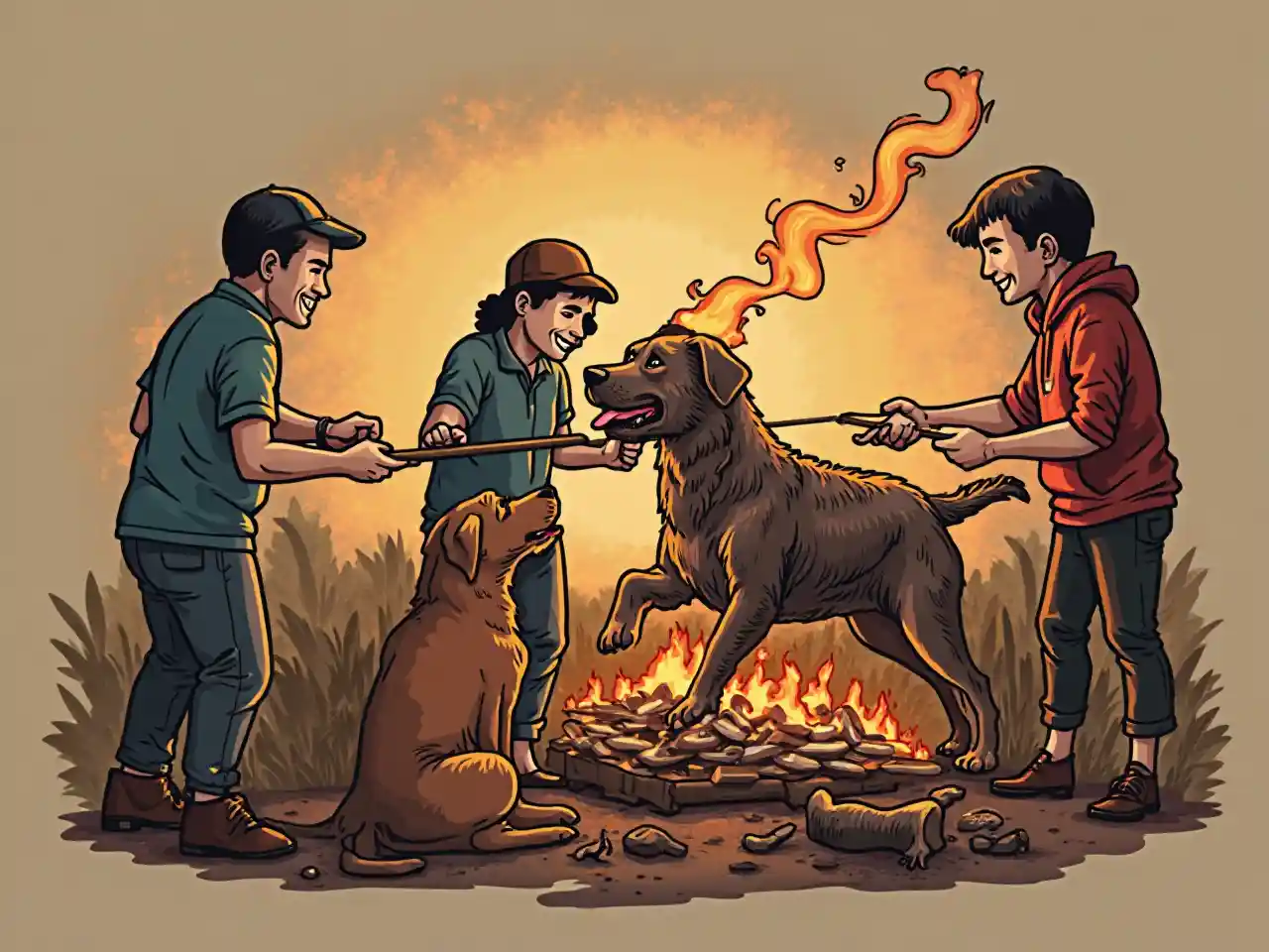 कुत्ते के मांस रेस्तरां का लोगो जिसमें एक कुत्ते को एक थूक पर रखा गया है।