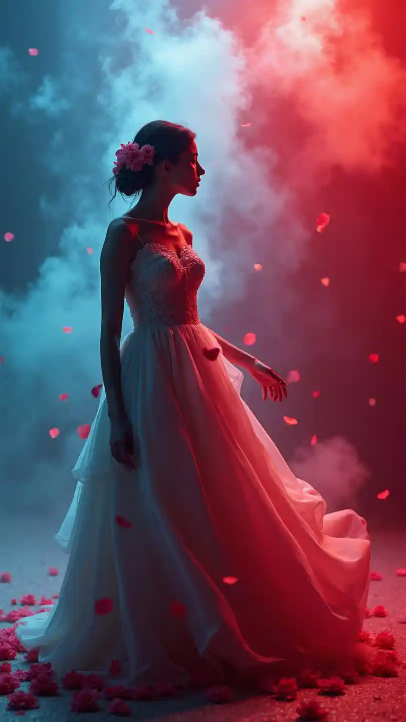 नरम डबल एक्सपोजर प्रभाव, महिला पोशाक, गुलाब पत्र सहयोग, लाल और नीले धुंध मंच, उच्च संकल्प, यथार्थवादी विवरण, पेशेवर ग्रेड, एचडी, स्टूडियो प्रकाश, चरम