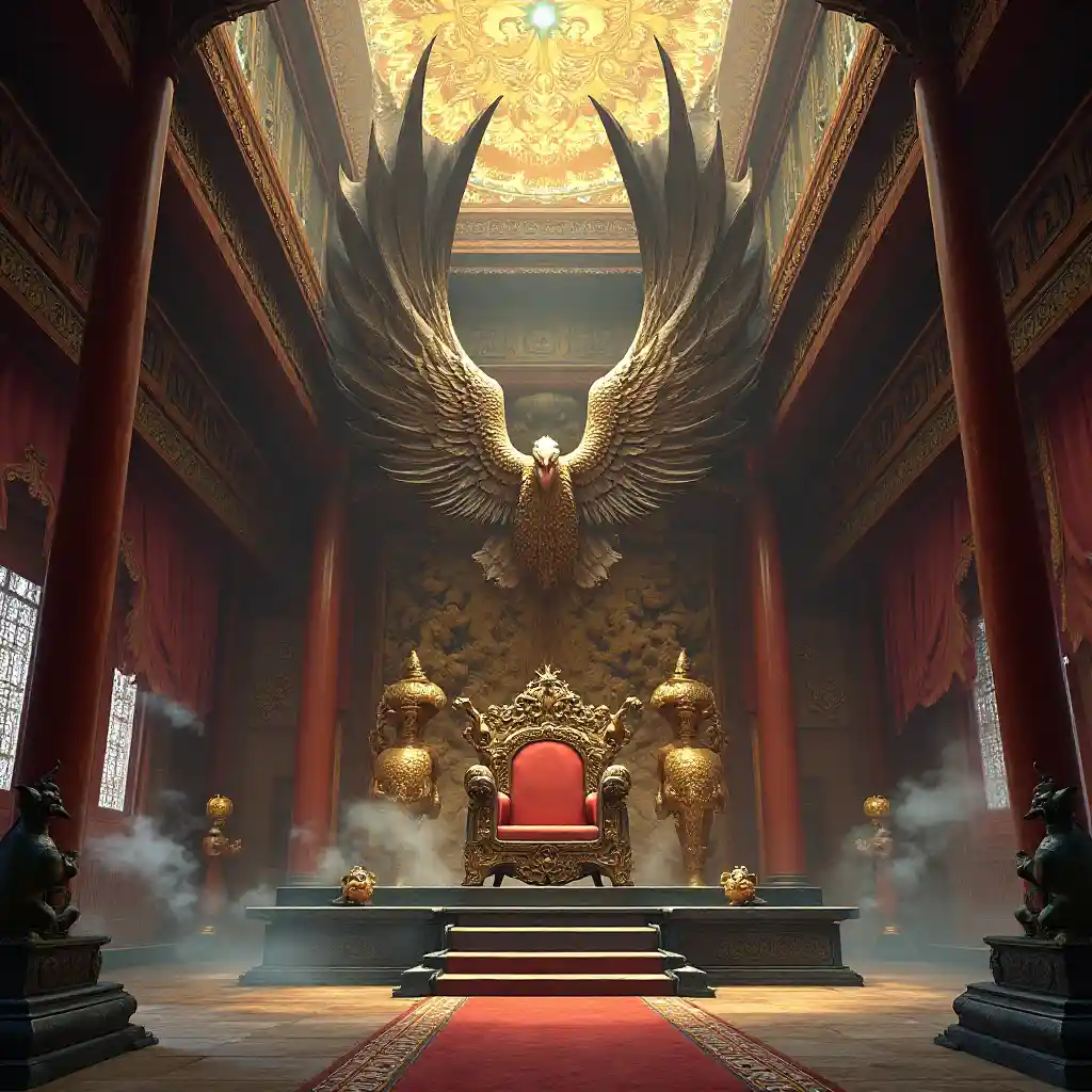 edit_rev_3_final.PSD: महान् कल्पना, प्राचीन ड्रैगन लॉर्ड का सिंहासन कक्ष, जटिल रूप से नक्काशीदार मोगनी, ऑब्सीडियन डेस पर कम झुका हुआ सिंहासन, पीछे की दीवार को पूरी छत में पत्थर में नक्काशीदार विशाल ईगल के पंखों से बदल दिया गया है, छत से लटके हुए रेशम के टेपेस्ट्री से सजे हैं, चमकदार लकड़ी के खंभों में गढ़े सोने के फीनिक्स प्रतीक, मंद रोशनी वाला कक्ष, जादुई कलाकृतियों से निकलने वाली शाश्वत चमक, प्राचीन रनस्टोन, जो कि फर्श को कवर करते हैं, विस्तृत लकड़ी की नक्शे के पार नृत्य करने वाले छाया, ड्रैगन के आकार के ब्राज़, जो कि महकती धुंध का उत्सण करते हैं, या छत से लटके हुए जडे आभूषण, भारी लाल घोंट सिंहासन के चारों ओर, समय की शक्ति का संकेत, रंगीन कांच की खिड़कियों से चमकती सोने की धूप धूल के कणों को प्रकाशित करती है, प्राचीन चीनी-प्रेरित वास्तुकला, शानदार सजावट, सिंहासन कक्ष में भूल गई किंवदंतियों की फुसफुसाहट होती है, मंत्रमुग्ध टेराकोटा योद्धाओं द्वारा पहरा दिया गया कक्ष, एक अदृश्य वाद्ययंत्र पर बजने वाले सूक्ष्म संगीत के द्वारा बढ़ाया गया रहस्यमय वातावरण, प्राचीन पुस्तकों और पुस्तकों का विशाल संग्रह, छत पर प्रक्षेपित प्राचीन आकाशीय नक्शा, महाकाव्य काल्पनिक शैली, पारंपरिक चीनी चित्रों की याद दिलाती जीवंत ब्रश स्ट्रोक
