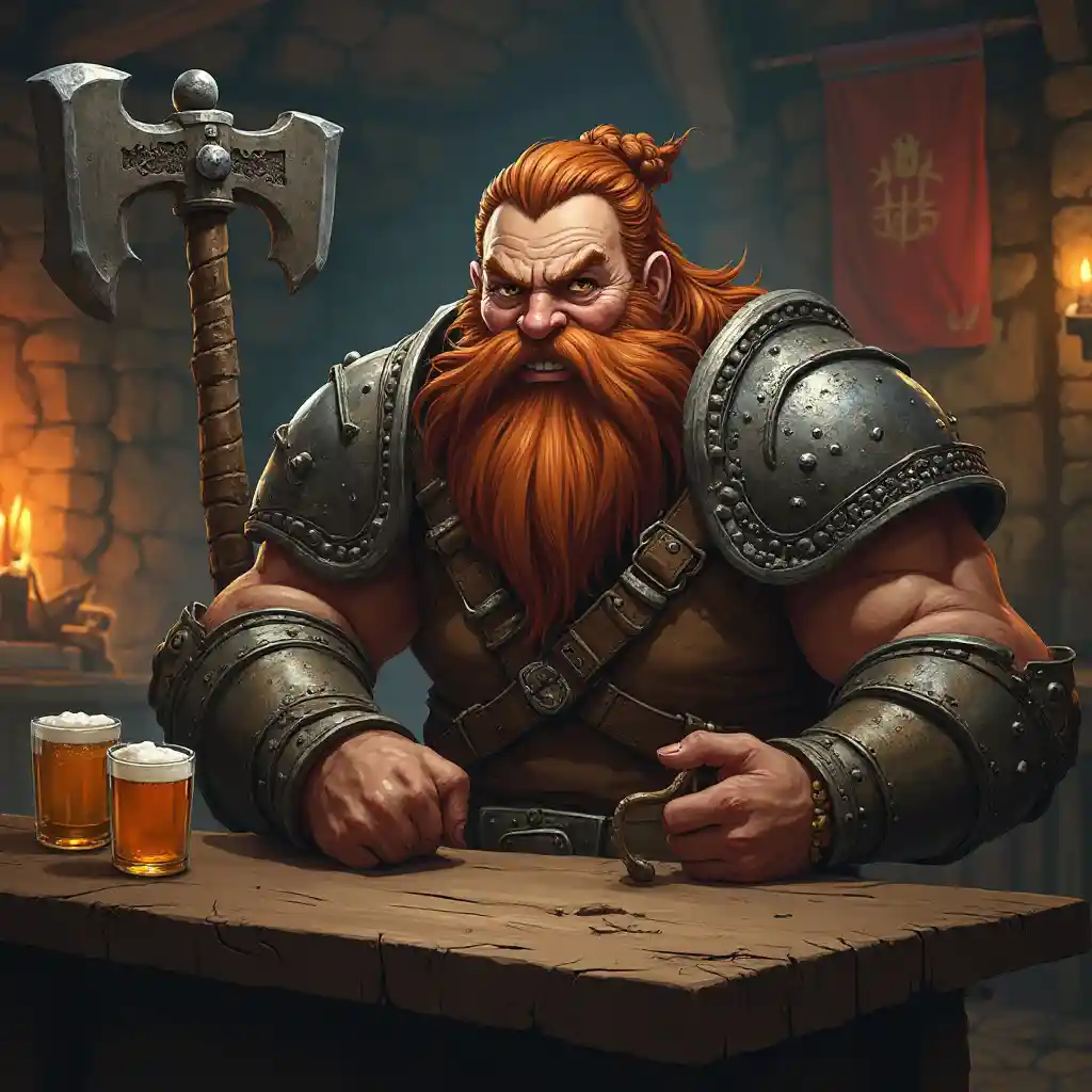एक मजबूत और युद्ध-कठोर बौना एक अत्यधिक विस्तृत एनीमे शैली में, एक मोटी, ब्लेड एबर्न दाढ़ी और अभूतपूर्व एम्बर आंखों दोनों ज्ञान और बुराई से चमकती है। वह लोहे की प्लेटों से सुसज्जित कठोर चमड़े के कवच पहनता है, जिसमें छोटे रून और उसके वंश के प्राचीन प्रतीक हैं। एक शक्तिशाली हाथ में, वह एक विशाल, जटिल रूप से गढ़ी गई युद्ध कुल्हाड़ी रखता है, जिसका ब्लेड पूर्वजों के डिजाइनों से गढ़ा हुआ है और पुराने जादू से हल्का चमक रहा है। वह एक जीवंत, धुंधली रोशनी वाले सराय में एक भारी लकड़ी की मेज पर गर्व से बैठा है, जिसमें बीयर के कप, जोर से हँसी और एक बड़ी चिमनी की आवाज है। पृष्ठभूमि में पत्थर की दीवारों, लकड़ी की बीमों और छत से लटकने वाले बैनरों की गर्मी को पकड़ लिया गया है, जिससे एक आराम और जीवंत कल्पना की माहौल बन रही है। छवि शैली अत्यधिक विस्तृत यथार्थवादी एनीमे है, जिसमें समृद्ध बनावट, चमकदार प्रकाश प्रभाव और एक मजबूत, जीवंत मूड है।