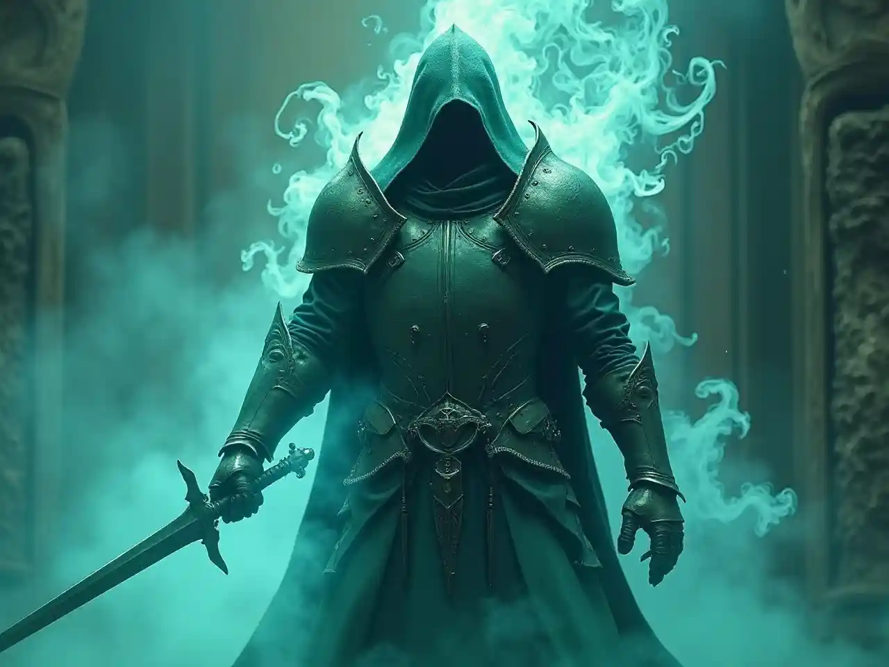 अति-वास्तविक तैरता कवच, कार्रवाई में एक तलवार पकड़, अंदर भूत की तरह आकृति, धुएं के नीले हरे टुकड़े, आकर्षक कल्पना चरित्र कला, विस्तृत बनावट, अंधेरा और अजीब माहौल, रहस्यमय प्रकाश, रहस्य और साहसिक कार्य, अति-विवरण, उच्च गुणवत्ता, सिनेमाई गहराई, धुएं के प्रभाव, नाटकीय वातावरण, मंत्रमुग्ध.