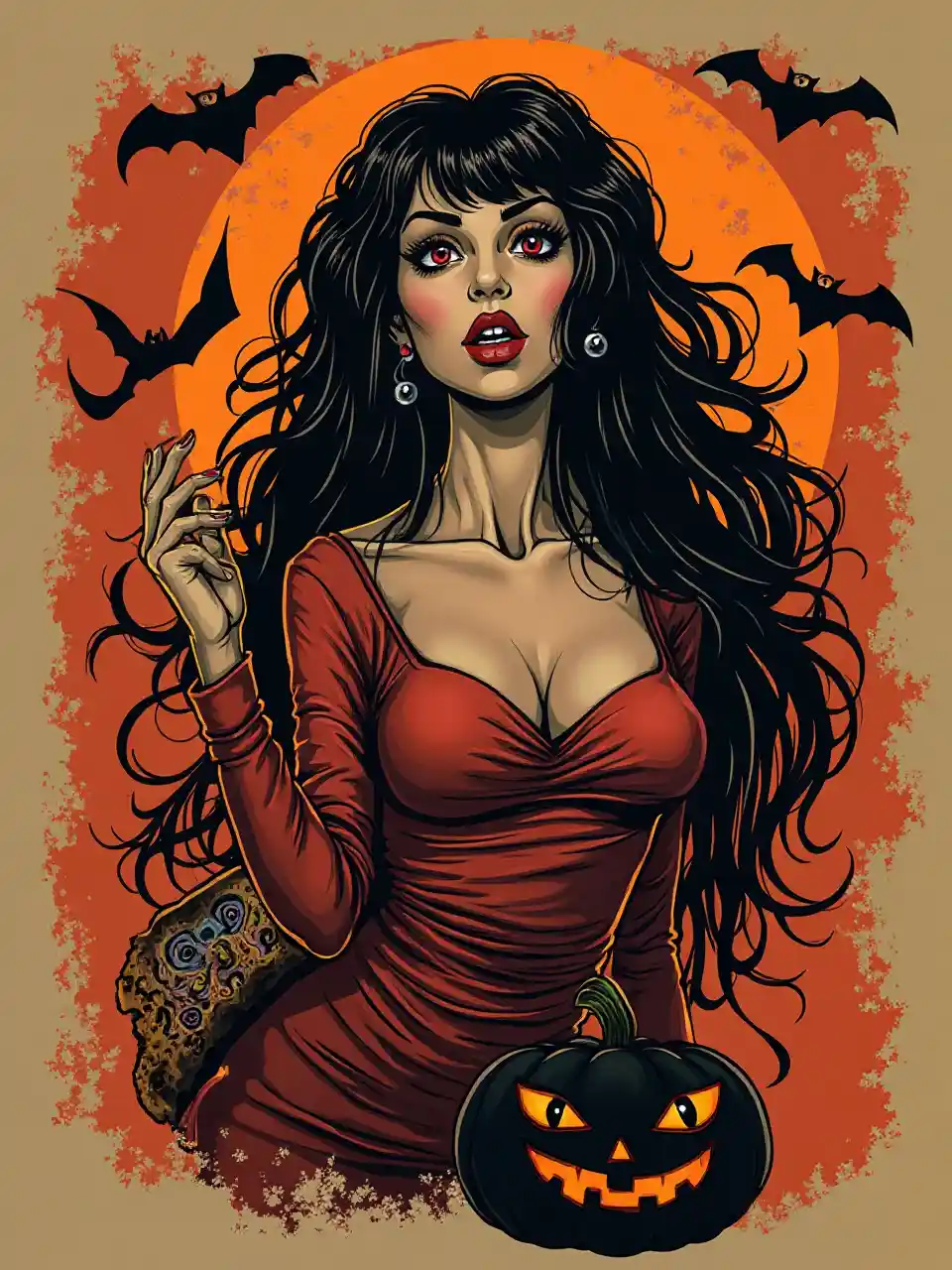 1950 की बी-फिल्म हॉरर हेलोवीन टी-शर्ट प्रिंट डिजाइन जिसमें एल्विरा है