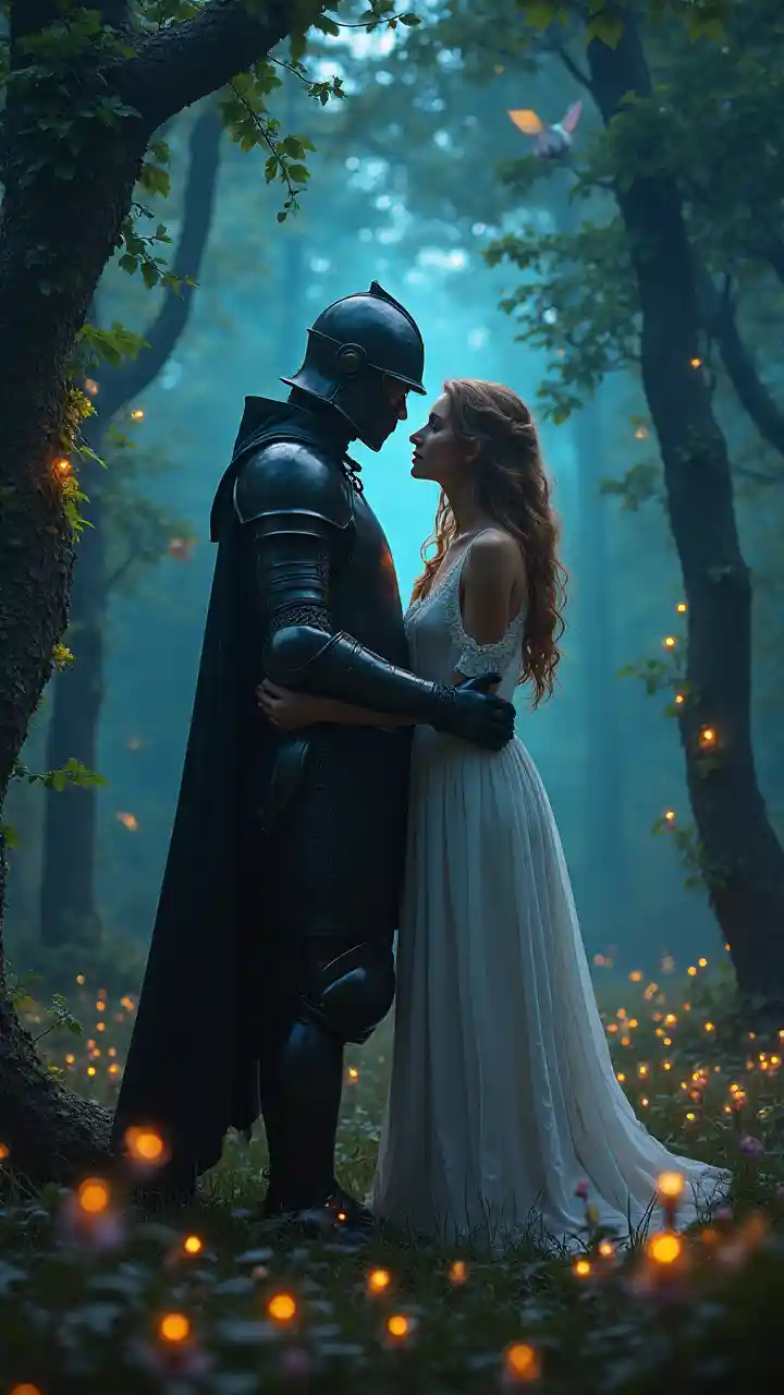 एक सुंदर महिला द्वारा एक काले कवच में एक शूरवीर के साथ एक सुंदर महिला द्वारा आयोजित किया जाता है, एक परी जंगल में, आभा, रात, सितारे, पवित्र पेड़, फूल, पिक्स